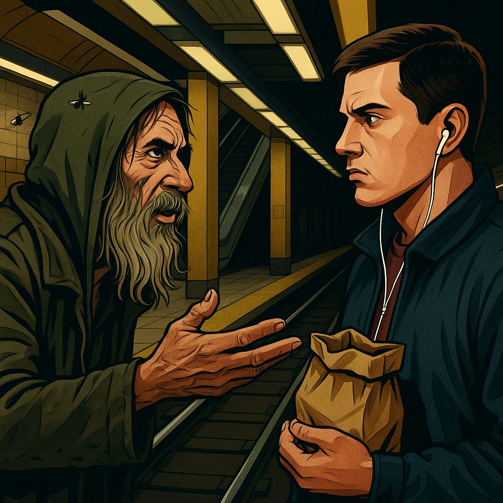 A man’s quiet disgust toward a vagrant escalates into a confrontation that forces him to face his own hypocrisy.